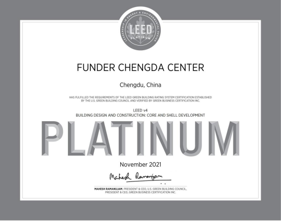 目前LEED认证采用的LEED v4标准,主要从创新设计、选址与交通、可持续场地、用水效率、能源与大气、材料与资源、室内环境、地域优先等八大指标对建筑物进行考察评估,将建筑分为认证级、银级、金级、铂金级。铂金级是LEED中最顶级的认证,全球仅有5%的写字楼能获此殊荣,是无数企业和项目的最大目标之一。丰德成达中心作为成都中心的商务核心,不仅是一个地标,更是拉高了成都建筑标准,成为四川首家获得LEED v4 CS铂金级的认证项目!